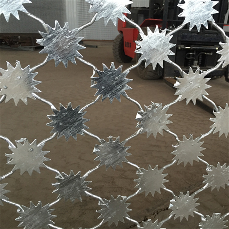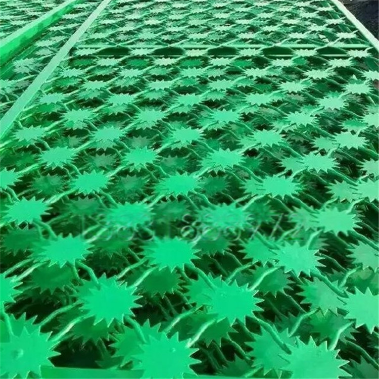 1、梅花刺隔離網為單層梅花刺片網,直徑不小于7.5cm,刺片厚1.5mm,采用Q235低碳鋼板沖壓成型。