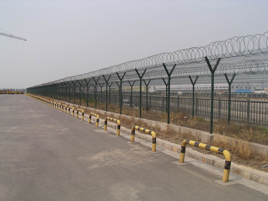 機(jī)場(chǎng)圍界是機(jī)場(chǎng)的重要安全防護(hù)網(wǎng),我廠生產(chǎn)的護(hù)欄網(wǎng)超過(guò)國(guó)家標(biāo)準(zhǔn)可以使用15年以上現(xiàn)在機(jī)場(chǎng)鋼筋網(wǎng)圍界又稱作”機(jī)場(chǎng)防護(hù)欄”、"Y型安 全防御護(hù)網(wǎng)”,它是由V型支架立柱加強(qiáng)型焊接片網(wǎng),安全防盜連接件和熱鍍鋅刀片刺籠組成是強(qiáng)度和安全防御性級(jí)別很高的隔離柵產(chǎn)品。近年來(lái)被廣泛應(yīng)用在機(jī)場(chǎng),軍事基地等高安全場(chǎng)所。 注如果在機(jī)場(chǎng)護(hù)欄網(wǎng)頂部加裝刀片剌絲、刀片剌繩后又很好的增強(qiáng)了安全防護(hù)性能。機(jī)場(chǎng)圍界網(wǎng)可以采用電鍍、熱鍍、噴塑、浸塑等防腐形式,具有很好的抗老化、抗曬、耐候等特點(diǎn)。其產(chǎn)品造型美觀、花色多樣,既起到圍欄作用,又起到美化作用。我廠可以根據(jù)用戶需要定作各種規(guī)格尺寸的機(jī)場(chǎng)護(hù)欄機(jī)場(chǎng)防護(hù)設(shè)施。