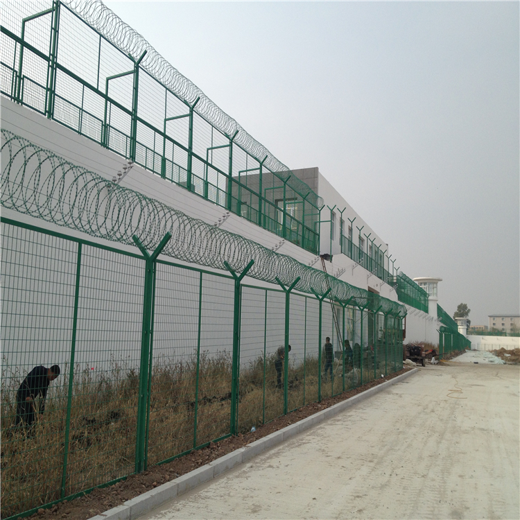 監(jiān)獄鋼網(wǎng)墻生產(chǎn)廠家、公安局戒毒所鋼網(wǎng)墻,監(jiān)獄 鋼網(wǎng)墻的生產(chǎn)構(gòu)造:由刀片剌繩、鋼絲網(wǎng)片與立柱組和而成。它主要采用不同規(guī)格的的金屬鐵絲經(jīng)焊接(編織)加工成網(wǎng)狀,主要絲徑有4.0m,4. 8mm, 5mm, 6mm。 網(wǎng)片加工的網(wǎng)孔規(guī)格有: 50X50m,70X1 50mm,80x1 60mm等等。網(wǎng)片兩側(cè)的防護立柱采用國標尺寸:圓柱:直徑48mmX2mm圓管 ,直徑60X3mn圓管,直徑80mmX5mn圓管等等:方管40X40nmX2. 5mm,48X48X3mm, 60X60X3mm等等。 客戶可根據(jù)實際要求選購。