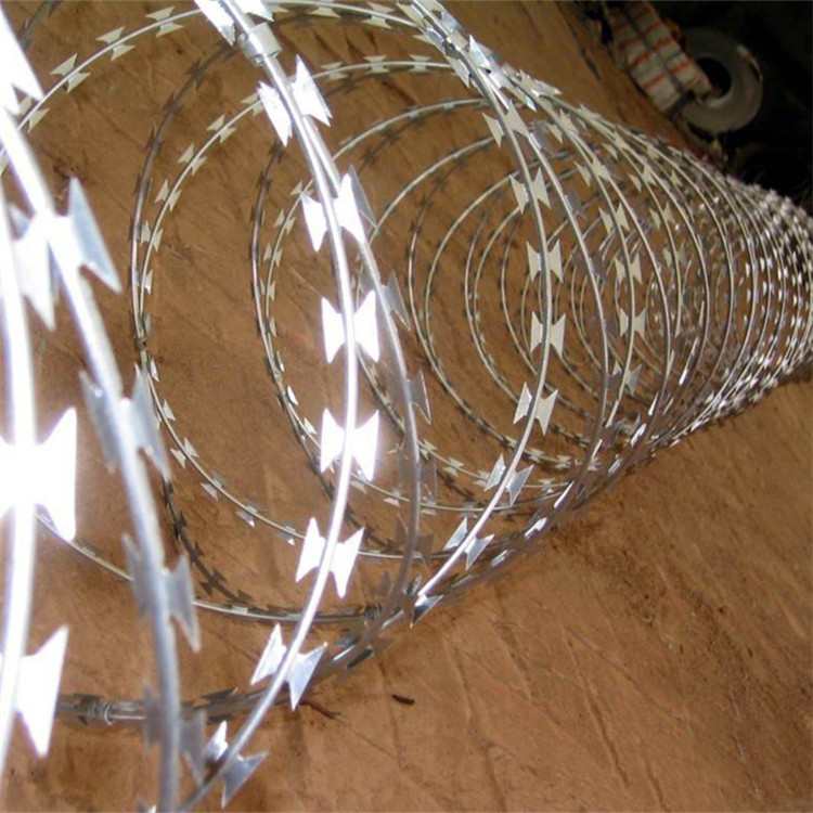 它采用鋼板沖壓成型包附于鋼絲(筋絲)之上,由銳利尖角鍍鋅鋼板或不銹鋼薄板做刀片,高張力鋼絲做芯線組合而成的。鋒利的刀型刺由雙線扣裝后成蛇腹?fàn)睿让烙^又讓人不寒而栗.起到了很好的阻嚇作用。