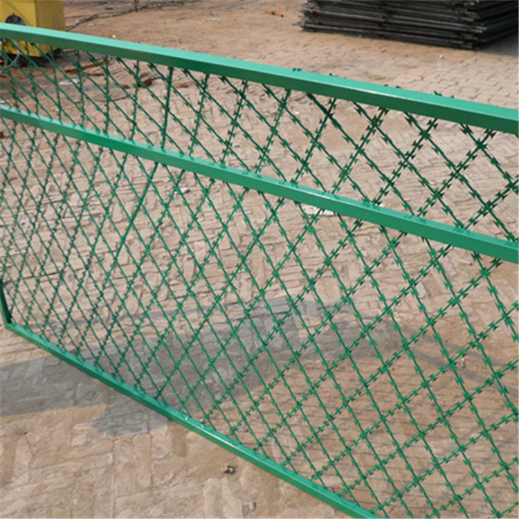 2、平板式刀片刺絲是刀片刺絲的一種新的應用方式,它是將單圈式刀片刺網平壓成板狀,或將兩件單圈刺網壓平后交叉相錯使用,外表美觀而且實用,可與直線式刀片刺絲搭配使用,構成下直線上平板的防護墻,或僅用平板式刺絲構成防護墻。主要適用于小區、倉庫、畜牧廠、農場、礦山、監獄、國防重地等。